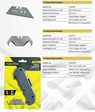 Naxoflex SRA100 Tam Emniyetli Maket bıçağı Ürün Kodu: LP-NXSRA100 WhatsApp Sipariş Genel Bakış Diğer Özellikler Kesim sonunu otomatik algılama ve tam emniyet sistemi Güçlendirilmiş kırılmaz gövde Ergonomik ve hafif tasarım Kolay yedek bıçak değişimi Düz ve kanca uç ile farklı kesim işlemlerine uygunluk 2+1 Yedek dahildir.